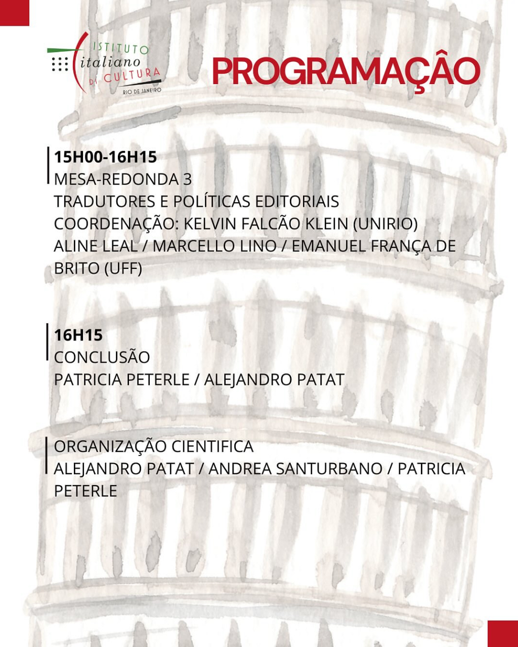 O volume se encerra com um posfácio de Marco Marica, diretor do Istituto Italiano di Cultura do Rio de Janeiro, que destaca a importância da iniciativa do evento de colocar em debate, pela via da tradução, a presença da literatura italiana nas culturas latino-americanas. Esse é, sem dúvida, o tom geral do volume, mas sua contribuição mais relevante está no modo como os artigos, restritos a seus horizontes argumentativos, dão mostra da riqueza do panorama de pesquisa no que diz respeito aos atravessamentos culturais entre Itália, Brasil e Argentina. Em cada capítulo, reconhecemos não apenas os fatos e as informações, mas também as feições específicas de cada investigação, os percursos únicos de pesquisadoras e pesquisadores através das questões que movimentam, dia após dia, seus trabalhos. Essa variação de experiências e pontos de vista condensada no volume L’Italia tradotta, de resto, condiz com aquilo que esperamos da própria ideia de “universidade”: uma comunidade fundada na troca e na diferença.