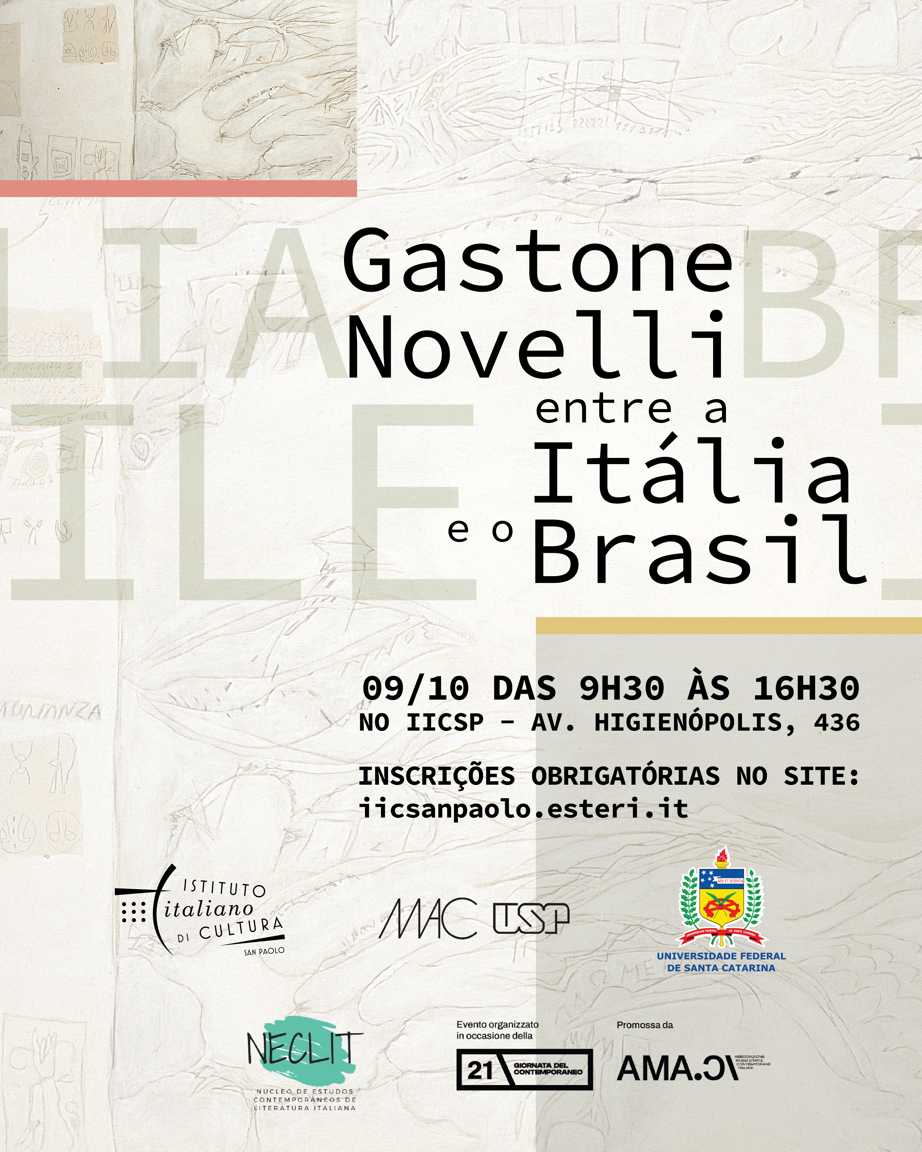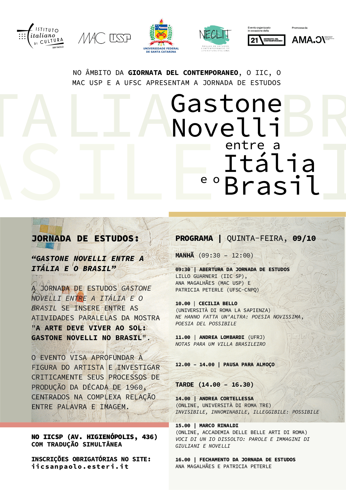 A jornada visa aprofundar a compreensão da complexa figura do artista italiano Gastone Novelli e investigar criticamente seus processos de produção da década de 1960, período marcado pela exploração da intrincada relação entre palavra e imagem em sua obra. O encontro reunirá pesquisadores brasileiros e italianos em um diálogo interdisciplinar sobre a produção artística de Novelli e sua relevância no contexto das relações culturais entre Itália e Brasil.